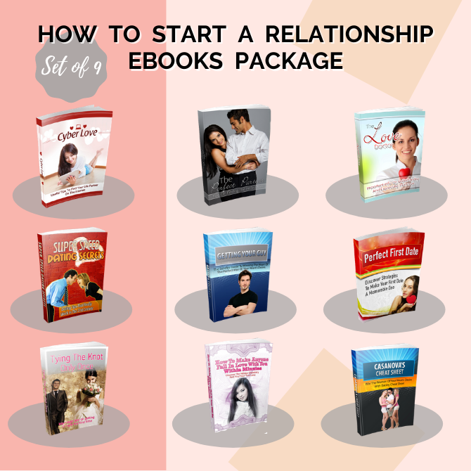 Introducing Set of 9 - How to Start a Relationship Ebooks -In these ebooks, you will discover how to begin and maintain a lasting relationship, dos and donts in finding a perfect partner and the essential things to do to easily get the one you.